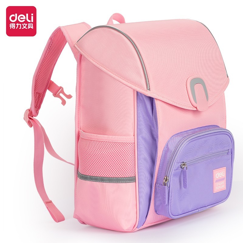 得力BB132简约系列盖头秒开合弹跳后幅书包(粉)(个)